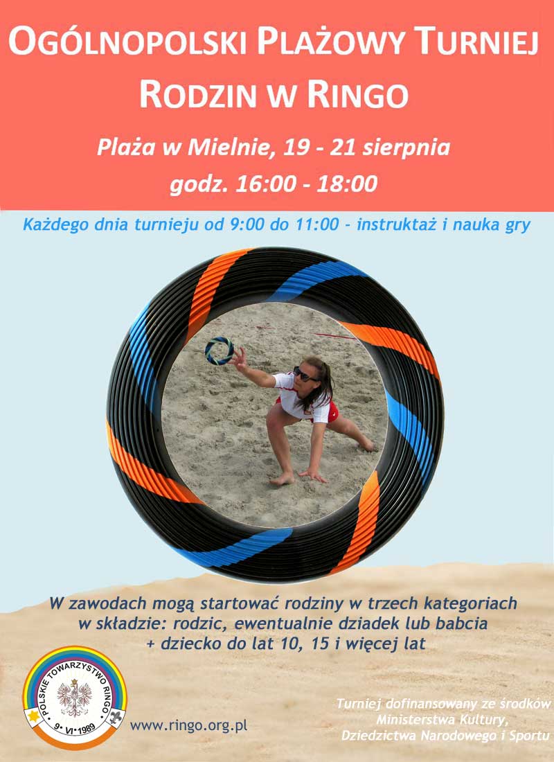 Zapraszamy rodziny do startu w Plażowym Turnieju Rodzin w Ringo, zawody odbędą się w dniach 19 - 21 sierpnia 2021r. na plaży w Mielnie w godz. 16: 00 - 18: 00. Każdego dnia turnieju od 9:00 do 11:00 - instruktaż i nauka gry. W zawodach mogą startować rodziny w składzie: rodzic, ewentualnie dziadek lub babcia + dziecko do lat 10, 15 i więcej lat.